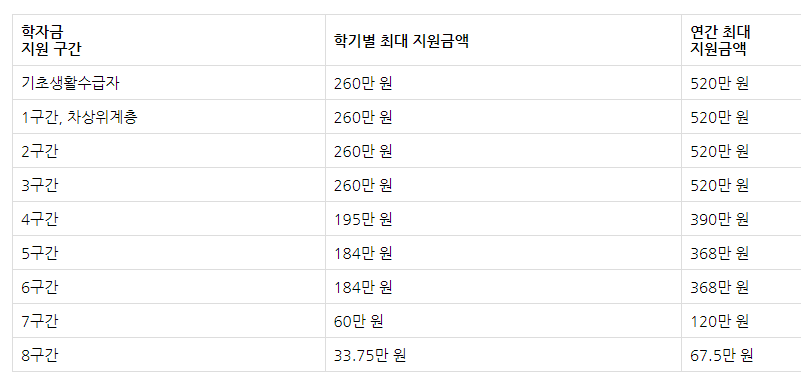 3구간까지는 학기별로 260만 원, 연간 520만 원까지 지원받을 수 있고 구간 숫자가 높아질수록 지원금이 줄어드는 것을 확인할 수 있습니다.