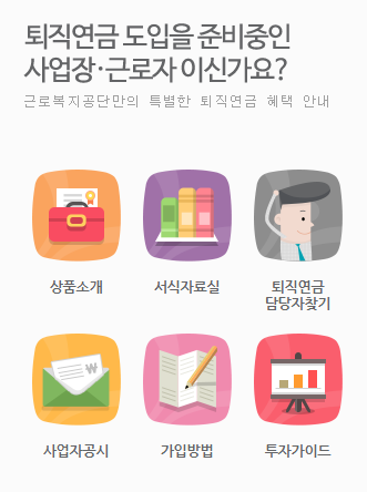 근로복지공단 퇴직연금서비스는 30인 이하 사업장을 위한 것으로 확정급여형(DB)를 제외한 확정기여형(DC)과 개인형퇴직연금(IRP)를 제공하고 있다. 우리은행은 2010년부터 확정기여형의 자산관리를 하고 있다....