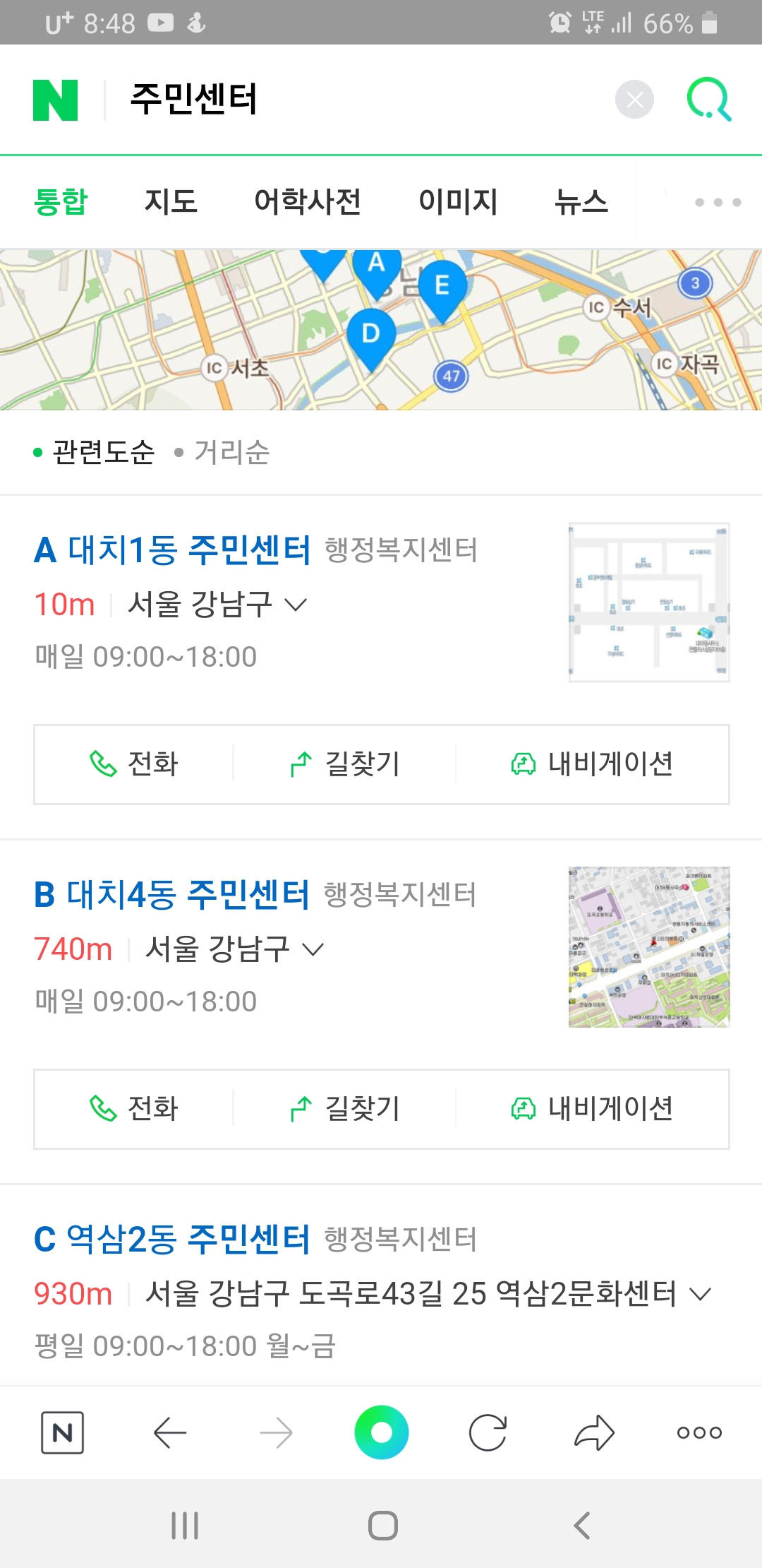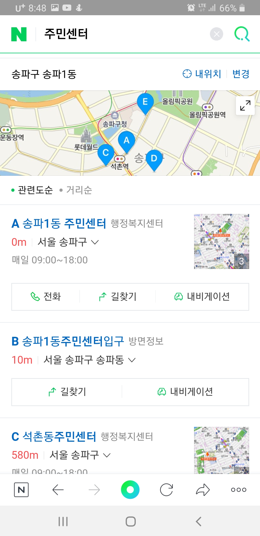 인터넷 시대이니 간단한 검색만 하면 정보를 확인해 볼 수 있습니다. 사진처럼 주민센터 검색하면 위치 기반으로 찾아주고요. 위치기반이 아니더라도 주소를 동명을 넣으면 해당 동의 주민센터 업무시간을 알려줍니다. 하지만 특별한 일이 없는한 전국의 주민센터는 나인 투 식스입니다. 사진들을 보면 각 행정복지센터 별로 전부 다 확인됩니다. 그래도 더 확실하게 하고 싶다면 전화로 직접 물어보는 방법도 있습니다.