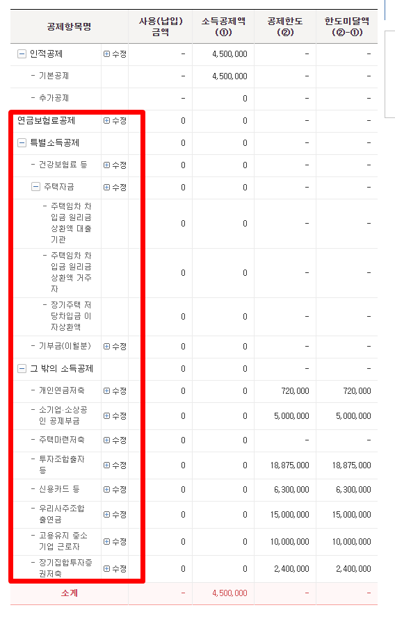 4. 연금보험료공제, 특별공제항목을 해당사항이 있을 경우 '+수정'버튼을 클릭하여 입력합니다.