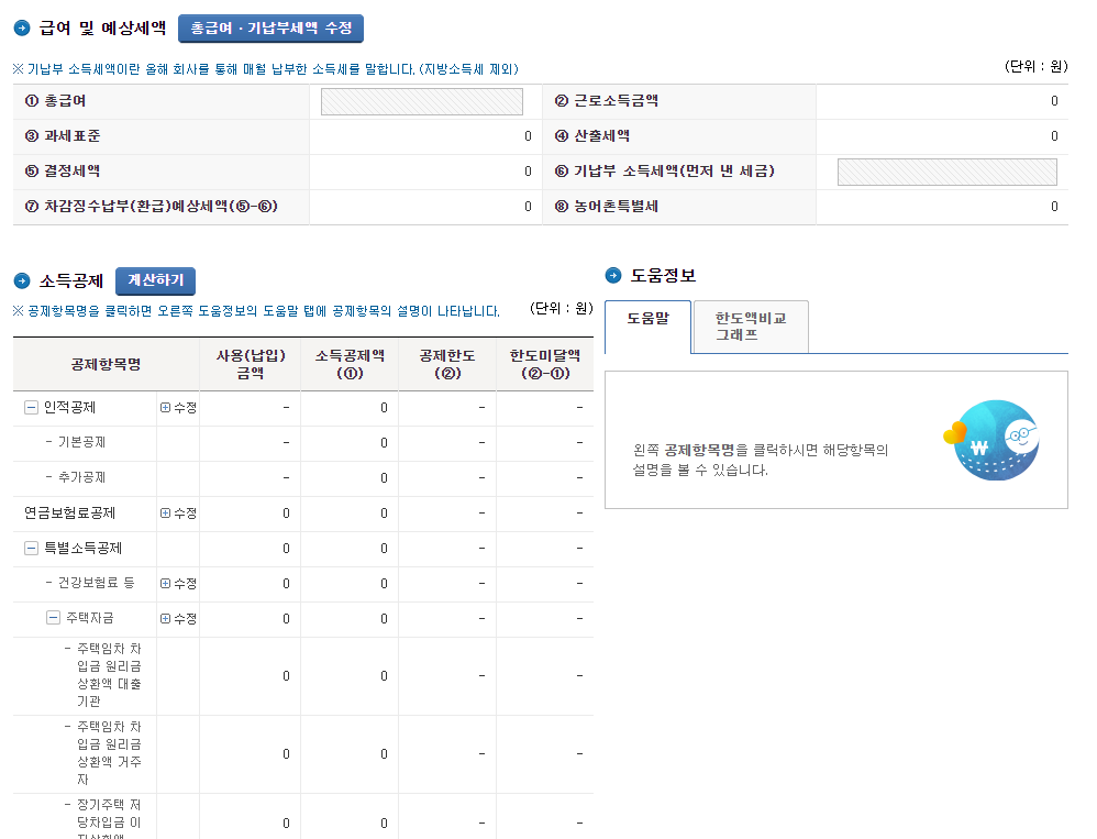 팝업창이 뜨면서 기본사항이 총급여와 소득세 기납부세액을 입력하는 창이 활성화됩니다.