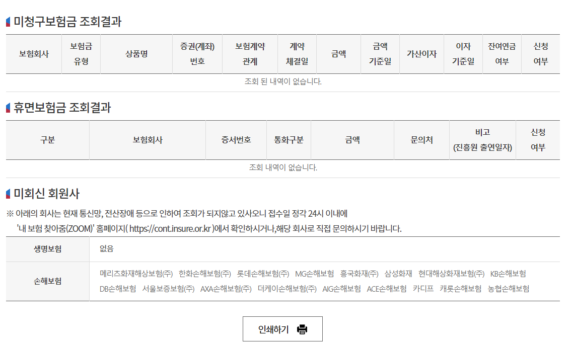 아래의 회사는 현재 통신망, 전상장애 등으로 인해 해당 보험사로부터 조회결과가 회신되지 않은 회사입니다.