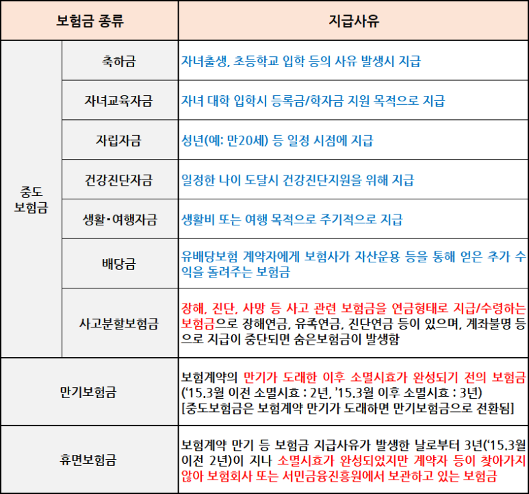 - 휴면보험금(만기 후 소멸시후 완성된 보험금) 등