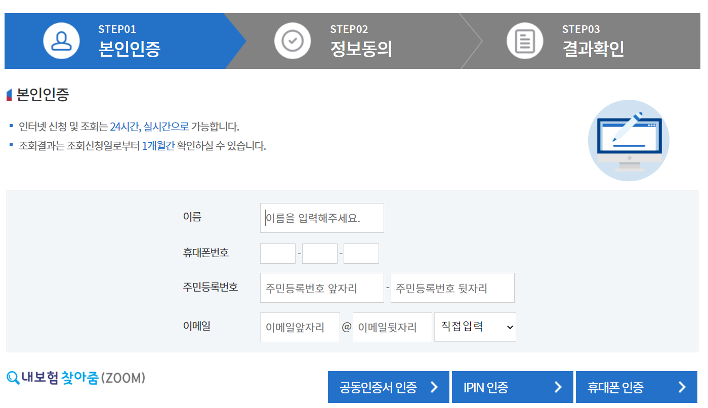공동인증서, IPIN, 휴대폰 인증 중 하나를 선택하고 정보 동의한다.