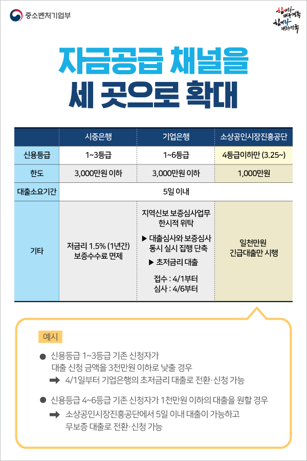 금융위는 이차보전대출(시중은행)과 초저금리대출(기업은행), 중기부는 경영안정자금(소진공) 진행상황 각각 점검