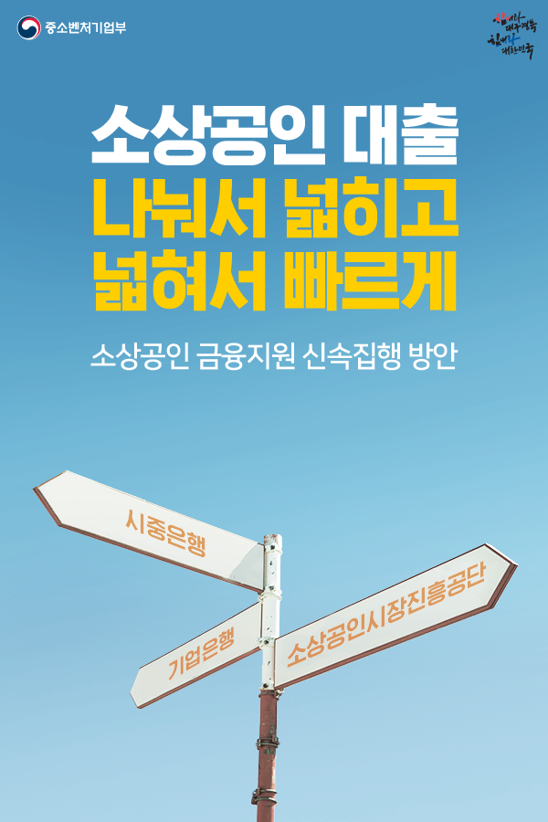 중소벤처기업부,기획재정부, 금융위원회 및 관계기관은 3월 27일 14시 공동브리핑을 개최하여 「코로나19 대응을 위한 소상공인 금융지원 신속집행 방안」을 마련하였습니다.