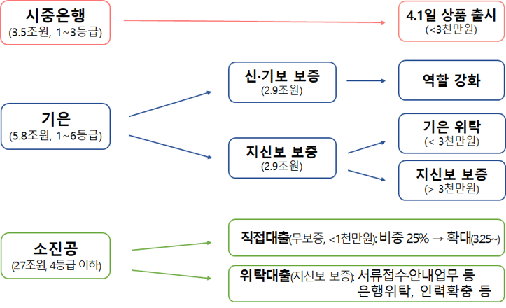 * 1) (신보) 3천만원 이하 보증의 기은 위탁 추진, (기보) 평가완화 통한 대상 확대