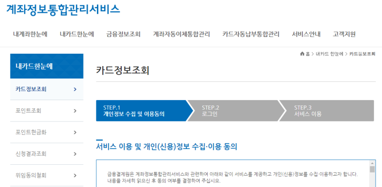 금융감독원은 기존 운용중인 '내 계좌 한눈에' 시스템 내에 '내 카드 한눈에' 메뉴를 신설·구축해 서비스하고 있다.