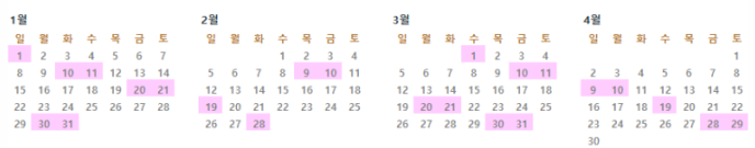 4월: 9일(일), 29일(토)