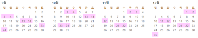 9월: 3일(일), 23일(토), 24일(일)