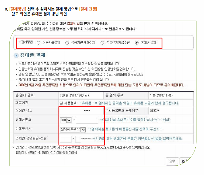 결제는 4가지 방식으로 할 수 있으며, 아래 모습은 휴대폰 결제의 예시입니다.