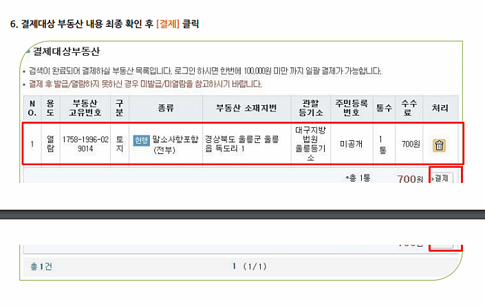 등기열람 할 부동산 내용 및 유형 선택하고 다음으로 넘어갑니다.