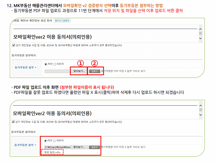 매물관리센터에서 모바일확인 V2 검증방식을 선택하고 등기부등본 PDF 파일을 첨부합니다.