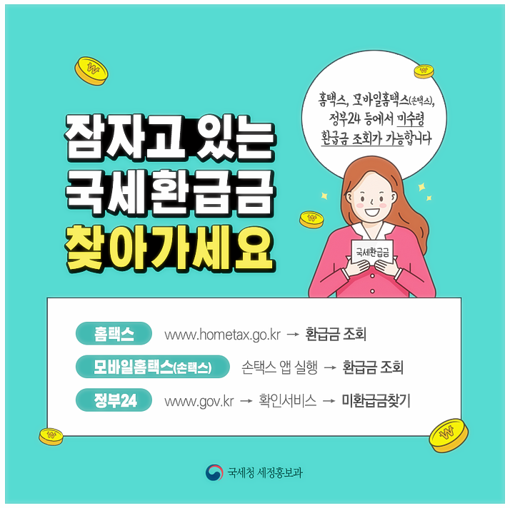 국세청 민원 웹사이트 '홈택스', 민원 모바일 앱 '손택스', 정부 통합 민원 웹사이트 '정부24'에서도 조회할 수 있습니다. 이번 시간에는 국세환급금 손택스 찾기 조회방법에 대해서 아래에서 확인해 보도록 하겠습니다.