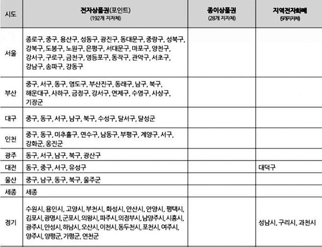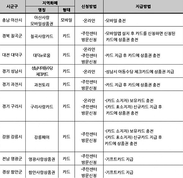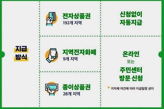 지급 방식은 지방자치단체(시군구)별 상이합니다. 아래 동동이가 직접 정리한 표를 참고 해 주세요. 참고로 전자상품권 : 197개 지역, 종이상품권 : 25개 지역 지역, 전자화폐 : 7개 지역으로 나뉩니다.