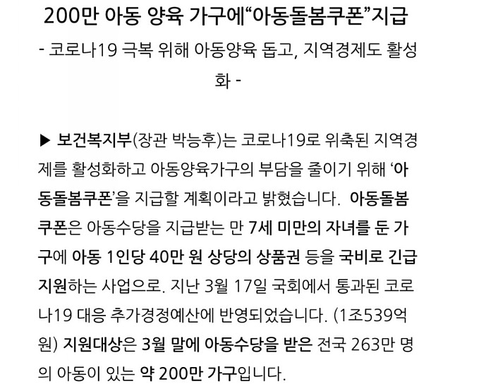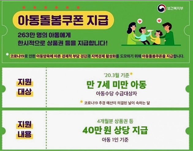아동돌봄쿠폰은 지난 3월기준 아동수당을 지급 받은 만 7세 미만 아동이 있는 가구로서 약 209만 가구가 이번 지원대상에 포함되며 아동 1인당 40만 원을 지급합니다.