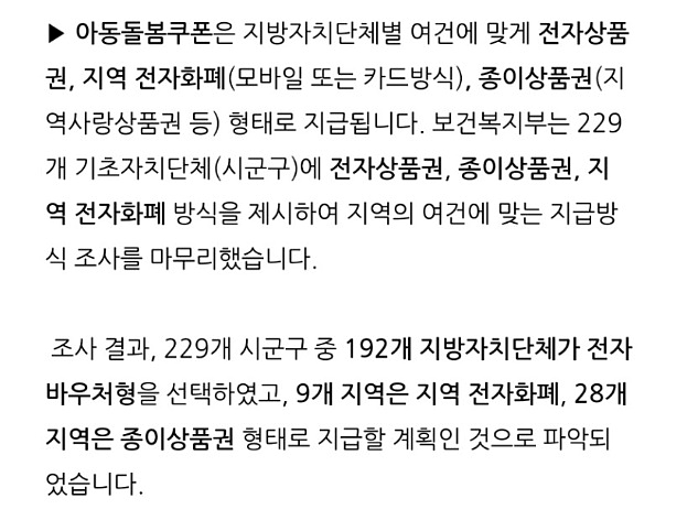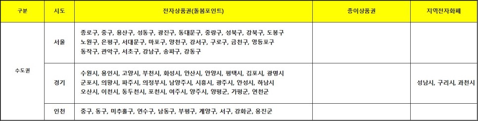 서울 25개구, 경기 25개시, 3개군, 인천 8개구, 2개 군에서는 전자상품권방식의 돌봄포인트를 제공하며 성남시, 구리시, 과천시에서는 지역전자화폐로 긴급재난지원금 코로나 아동수당 포인트가 지급됩니다. 그 외 지역에 대해서도 지급방식에 대해 차례로 정리 해보았습니다.