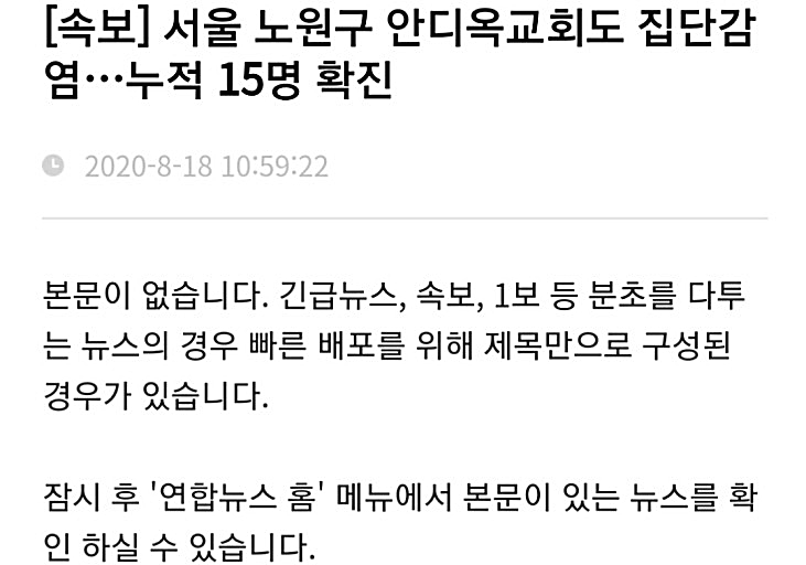 서울 노원구 안디옥교회에서도 집단감염이 발생한 것으로 확인됐다. 이 교회 교인 1명이 14일 처음 확진된 이후 16일까지 6명, 17일 8명이 추가로 확진돼 누적 확진자는 15명이 됐다. 이들은 모두 서울시 확진자다. 이 교회의 집단감염 발생 사실은 이날 처음 발표됐다. 자세한 내용은 아래를 참고해주세요!!