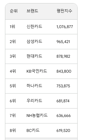 신한카드가 1위를 차지하였으며, 삼성카드와 현대카드가 각각 2위와 3위를 차지하였습니다. KB국민카드, 하나카드, 우리카드, NH농협카드, BC카드가 뒤를 이었습니다.