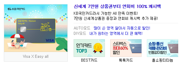 한편, KB국민카드는 오늘(20일)부터 오는 9월 30일까지 'VISA X Easy all, ALL-in' 이벤트를 실시한다. 20일부터 다음달 30일까지 신세계 상품권 7만원 이벤트를 진행하고 있다.